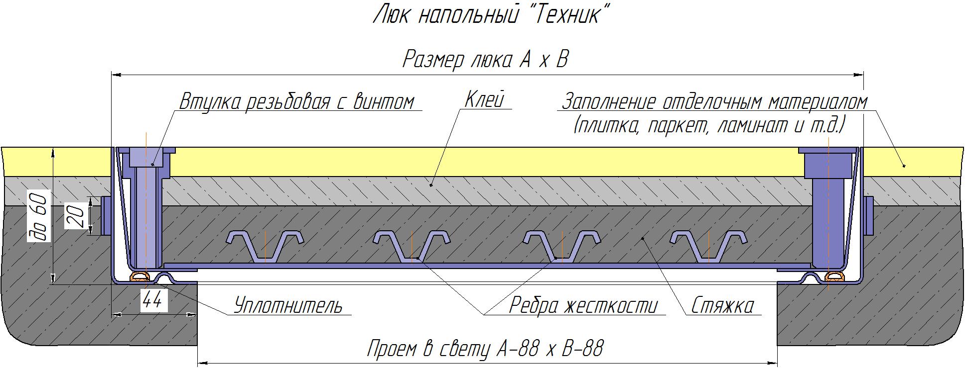 | Технические характеристики люка модели «ЛЮКС» | Особенность люка модели "Техник" Метод сборки на производстве: сварка аргонно-дуговая неплавящимся электродом (TIG). Материал: специальный стальной профиль толщиной 2-3 мм (в зависимости от пожеланий заказчика), оцинковка. Заполнение крышки: осуществляется заказчиком после монтажа. Угловые бобышки упрощают укладку плитки в крышку люка. Прочее: резиновый уплотнитель. Срок изготовления люков нестандартных размеров: 14 рабочих дней. Внимание! При пользовании люком необходимо соблюдать маркировку (сторона крышки с маркировкой должна совпадать с маркировкой на внутренней стороне рамы люка). Люк «Техник» - это идеальное решение для промышленных помещений и улицы. ВНИМАНИЕ!!!Производитель оставляет за собой право вносить изменения в конструкцию люка! |
